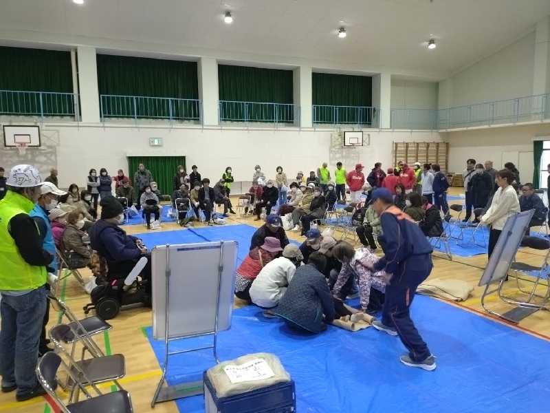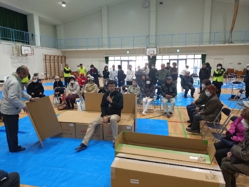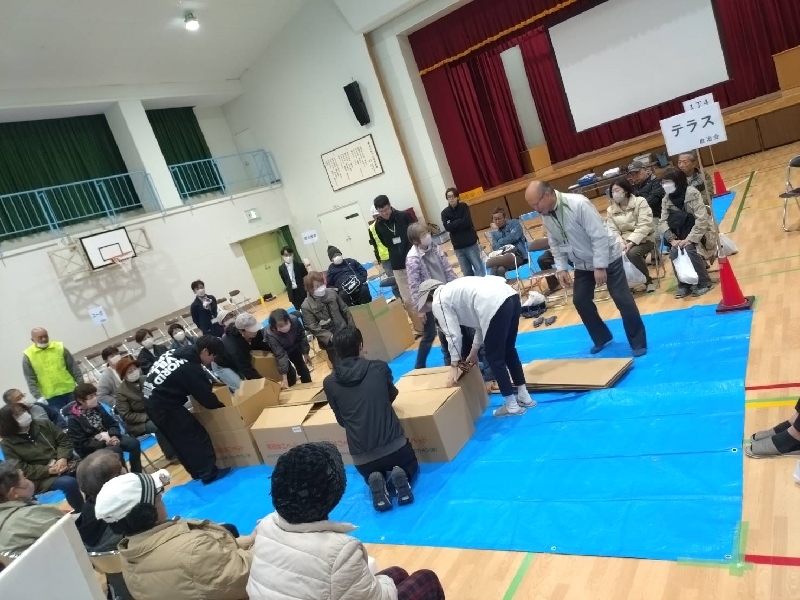 連合会長あいさつの後、区職員による最近の大分の大規模火災などの実例を紹介した共助の大切さのスライドや段ボールベッドの組み立て実演がありました。(体育館の板の間で寝るのはつらいですよ。みんなで組み立て方を覚えましょう。)