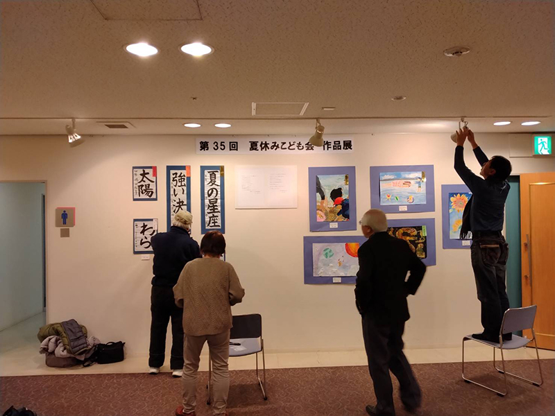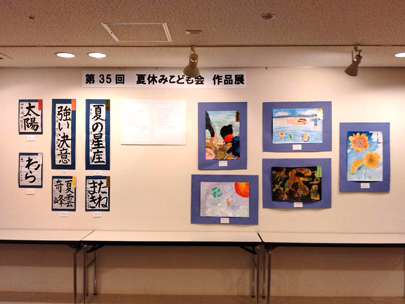 南ブロックこども会主催の 第35回夏休みこども作品展(習字・絵画・作文・詩の181点)が、南図書館で開催されました。