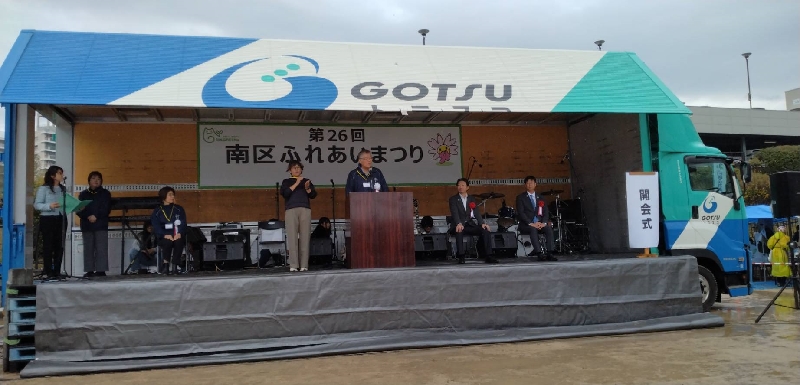 開会式には来賓代表として市長・市議会議長が登壇されご挨拶をいただき、雨天の中、まつりが始まりました。