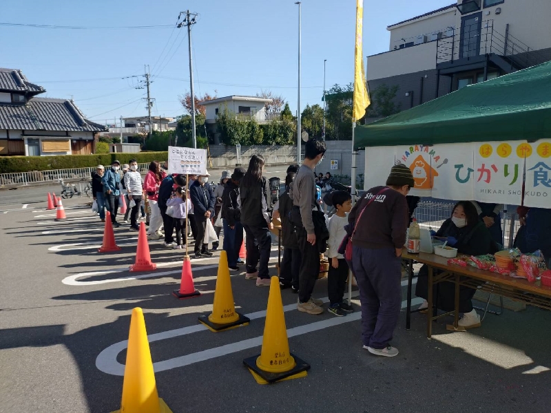 ゴールの地域会館(本館)では、「ひかり食堂」さんが定例の活動日としての位置づけで出店され、「たこせんべい」や「詰め合わせお菓子」、大人には「レトルトのお米」の配布がありました。手作りで大盛りの「たこせん」は、子どもたちだけでなく大人もおいしくいただきました。