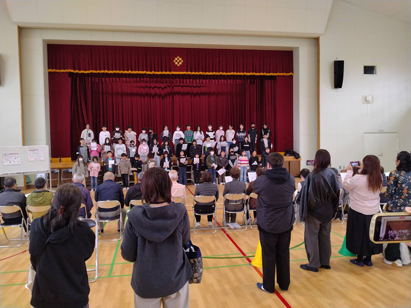ゲームが終わり、最後はステージに舞台を移し、5年生全員で、昨年の交流時に歌ってもらい好評だった「ね」という歌を合唱。参加者も歌詞カードを手に体を揺らして一緒に歌いました。
