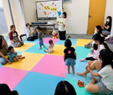 上神谷こども園の先生と一緒に手遊びをしたり、絵本やパネルシアターを見ました。紙コップにシールを貼ったり描いたりして、ぴょんぴょんカエルを作り、それを飛ばして遊びました。