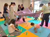 上神谷こども園の先生と一緒に、つながりあそびをしました。「ひとりのぞうさん」でつながったり、大きな布で「たかいたかい」をして遊んだり、最後はボールを放って楽しみました。