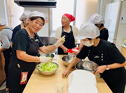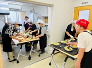 毎月第2・第4金曜日の福祉委員会ボランティアによる、ふれあい喫茶の調理風景です。9月に入ってもまだまだ暑い中、「野菜切った?」「盛り付けこれでいい?」と声をかけあい、手際よく出来上がっていきます。地域の皆さまが受付を済まし着席されると「さあ配膳始めるよ~」と一層ペースが速まります。汗をふきふき忙しい作業ですが、帰り際の「おいしかったよ」の一言に、疲れが一瞬で吹き飛び、ボランティアみんなが笑顔になりました。この日は、若松氏の演奏で合唱も楽しみました。
