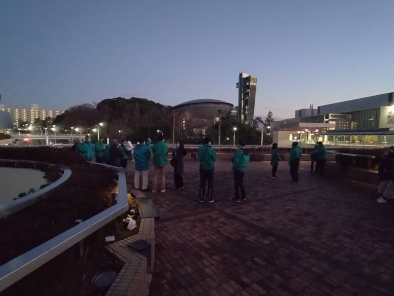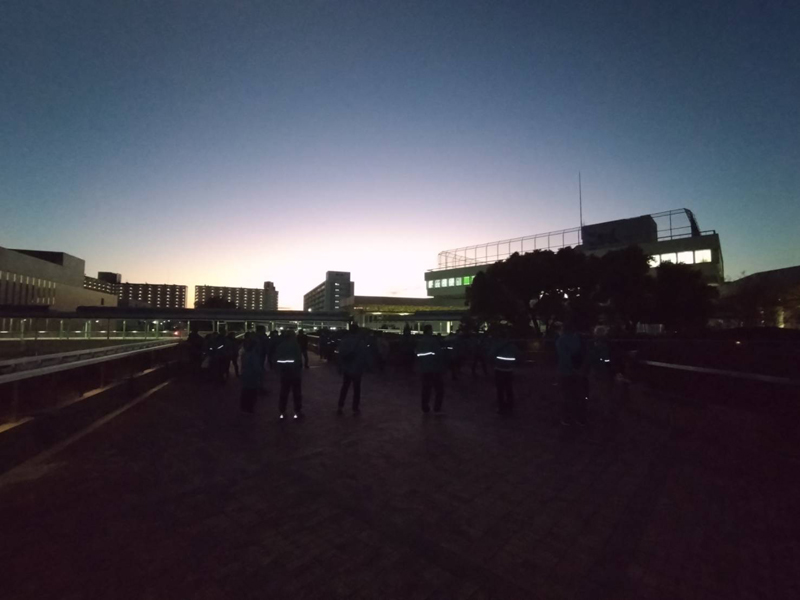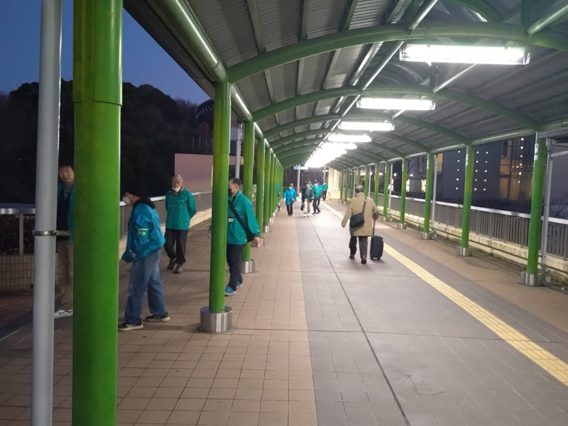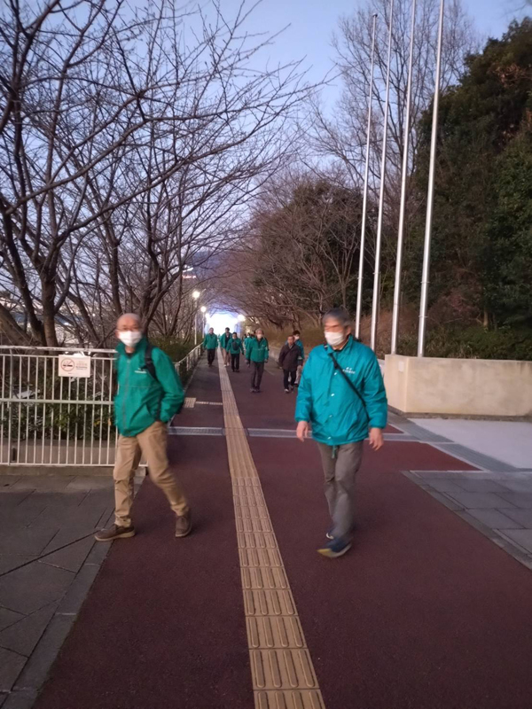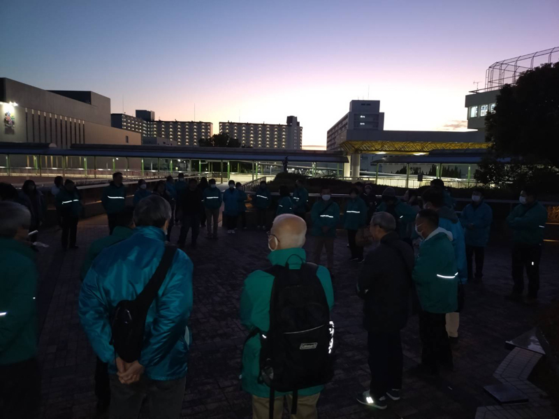 2月15日(土)17時30分に光明池ダイエー前広場に、南区内の青少年指導員55名が集まり、新檜尾台と城山台コースの2班に分かれて約40分の巡回を行った。