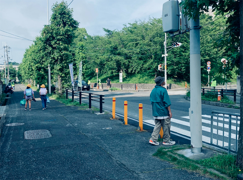 小学校の正門前交差点、地域会館(東館)前の交差点に加えて、緑道などの見守り巡回には原山のメンバー11人が、そして上神池横(元東小学校北側)交差点には栂の自治会や見守り隊のメンバー7~8人が立ち、それぞれ生徒の下校時の見守り・声がけを実施しました。