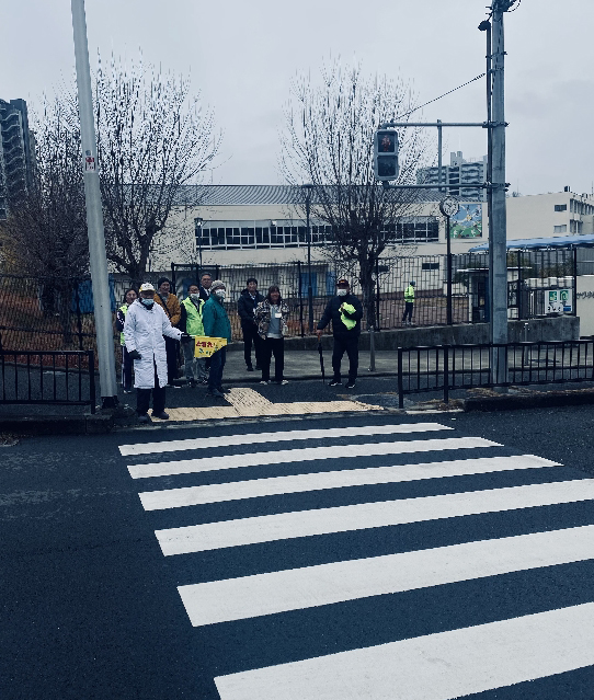 妹背校長先生や堺市教育委員会の職員さんもお見えでした。あいさつの後、原山緑道や地域会館(東館)前交差点等、それぞれ通学路に分かれて見守り・声がけ活動を行いました。